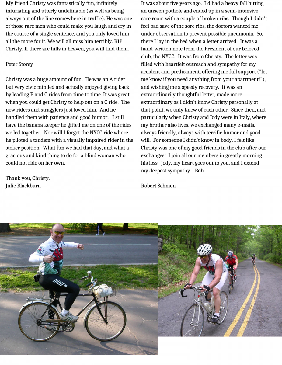 I was on the NYCC Board for Christy's second go around as president. Christy was a warm, charismatic leader who went out of his way to make all feel welcome. He rode with me several times on the rides I led and could not have been nicer, introducing himself to all the riders and hearing about what they liked about the NYCC. I have a place in my heart for Christy, and am saddened that I will not see him on the road.